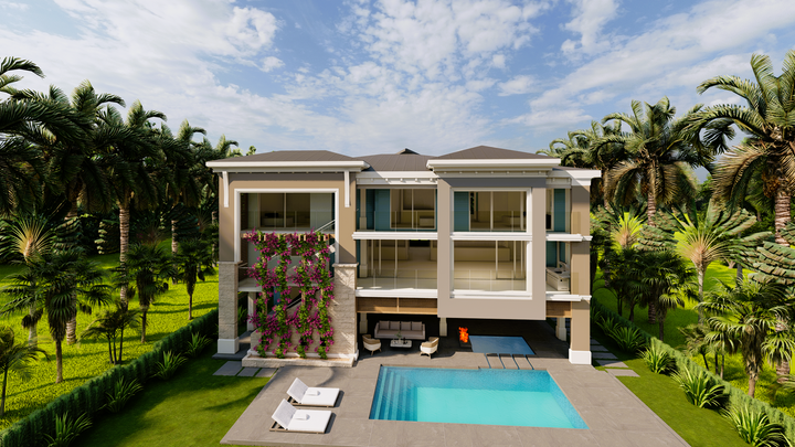 This 5,000 sq. ft. Key West-style residence is situated in Duck Key, Florida, overlooking a canal that connects directly to the ocean. Spread over three stories, the home takes full advantage of its waterfront location with expansive terraces designed for both circulation and entertainment. The architecture features the classic elements of Key West style, with decorative beams, corbels, and extended overhangs, embodying the charm and elegance of tropical living.